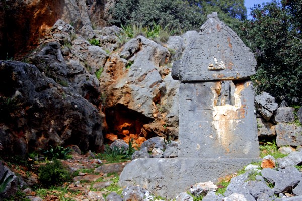 There are rock tombs at the east and south slopes of the acropolis and there is the Necropolis area with its sarcophaguses and tombs cut in native rock at the northwest slopes. Two of the rock tombs contain inscription in Lycian and the red paint on one of the tombs is still preserved. One of the most important features of the Kandyba settlement is the granary which was made in the form of a Lycian type tomb monument. Nearly 20 granaries were spotted made on a high stone foundation, all wooden and with the interlocking of wood beams.